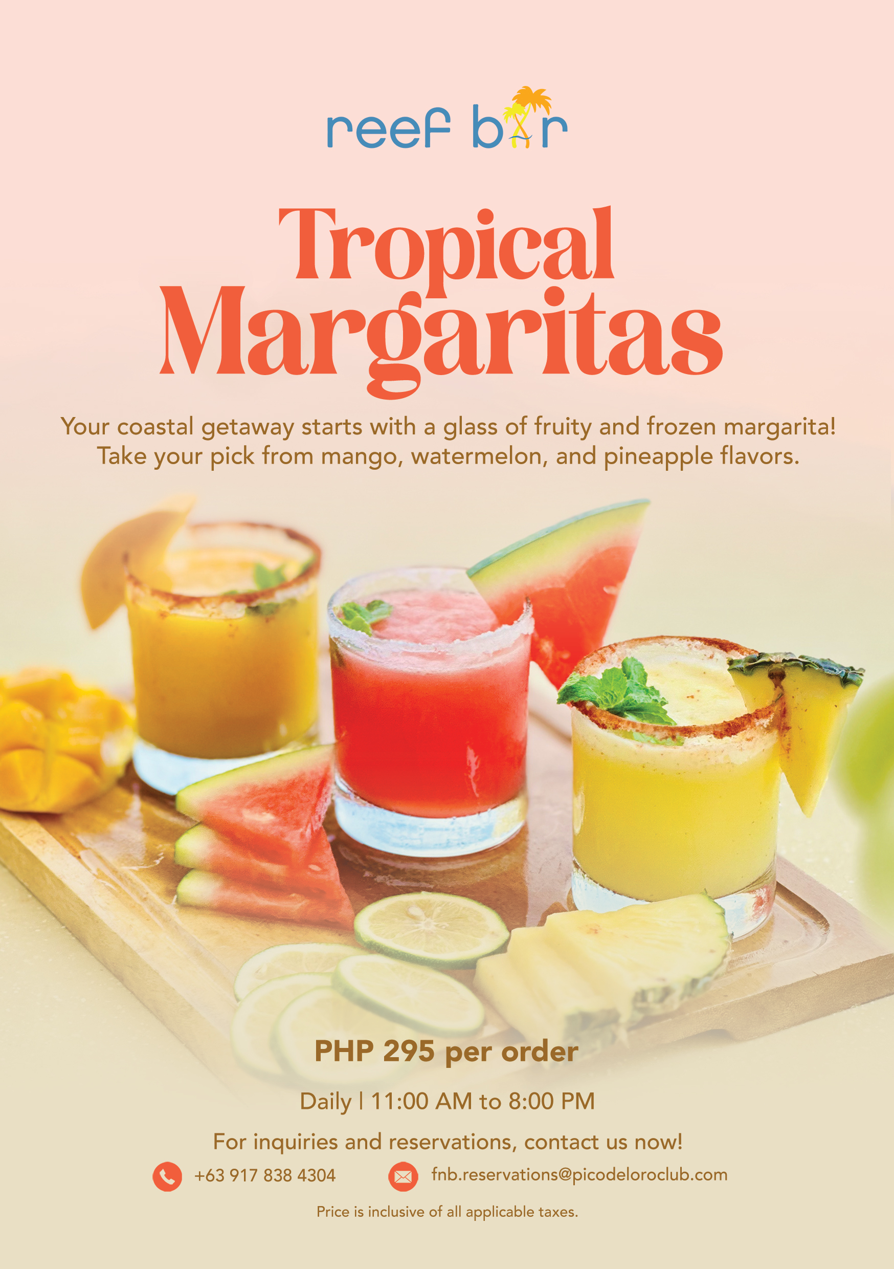 Your coastal getaway starts with a glass of fruity and frozen margaritas! Take your pick from mango, watermelon, and pineapple flavors